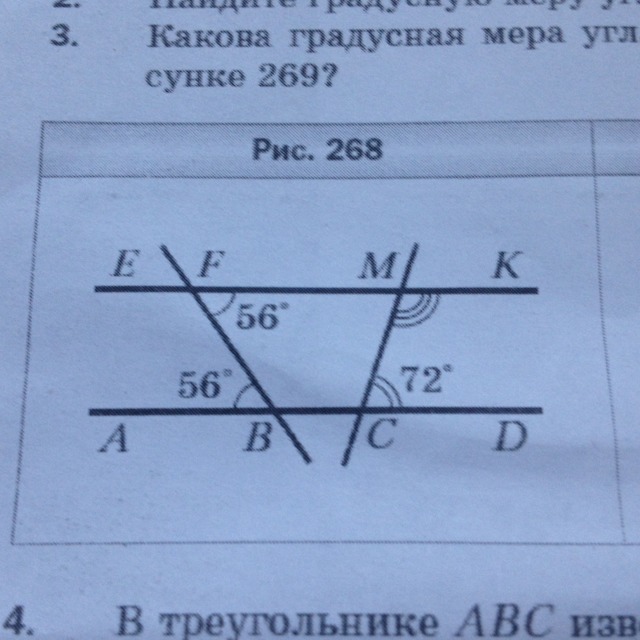 ∠MFB = ∠ABF = 56°. Эти углы являются накрест лежащими при прямых AD и EK и секущей FB, тогда по признаку AD║EK.