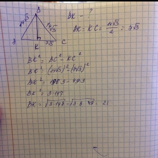 Сторона равностороннего треугольника равна 14√3. Найдите высоту этого треугольника. помогите пожалуйста
