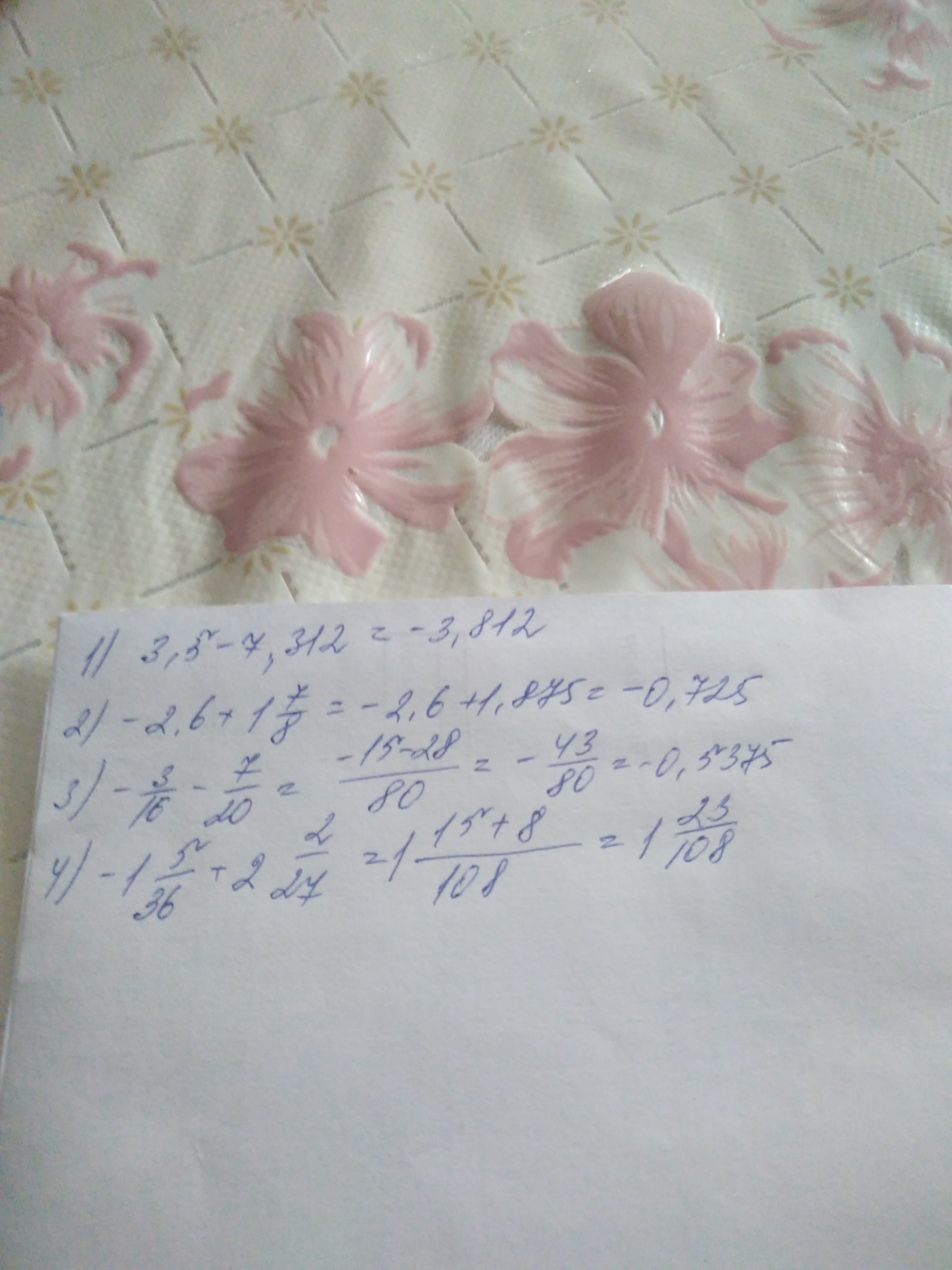 3,5-7,312; -2,6+1 7/8; -3/16-7/20; -1 5/36+2 2/27; решите пожалуйста