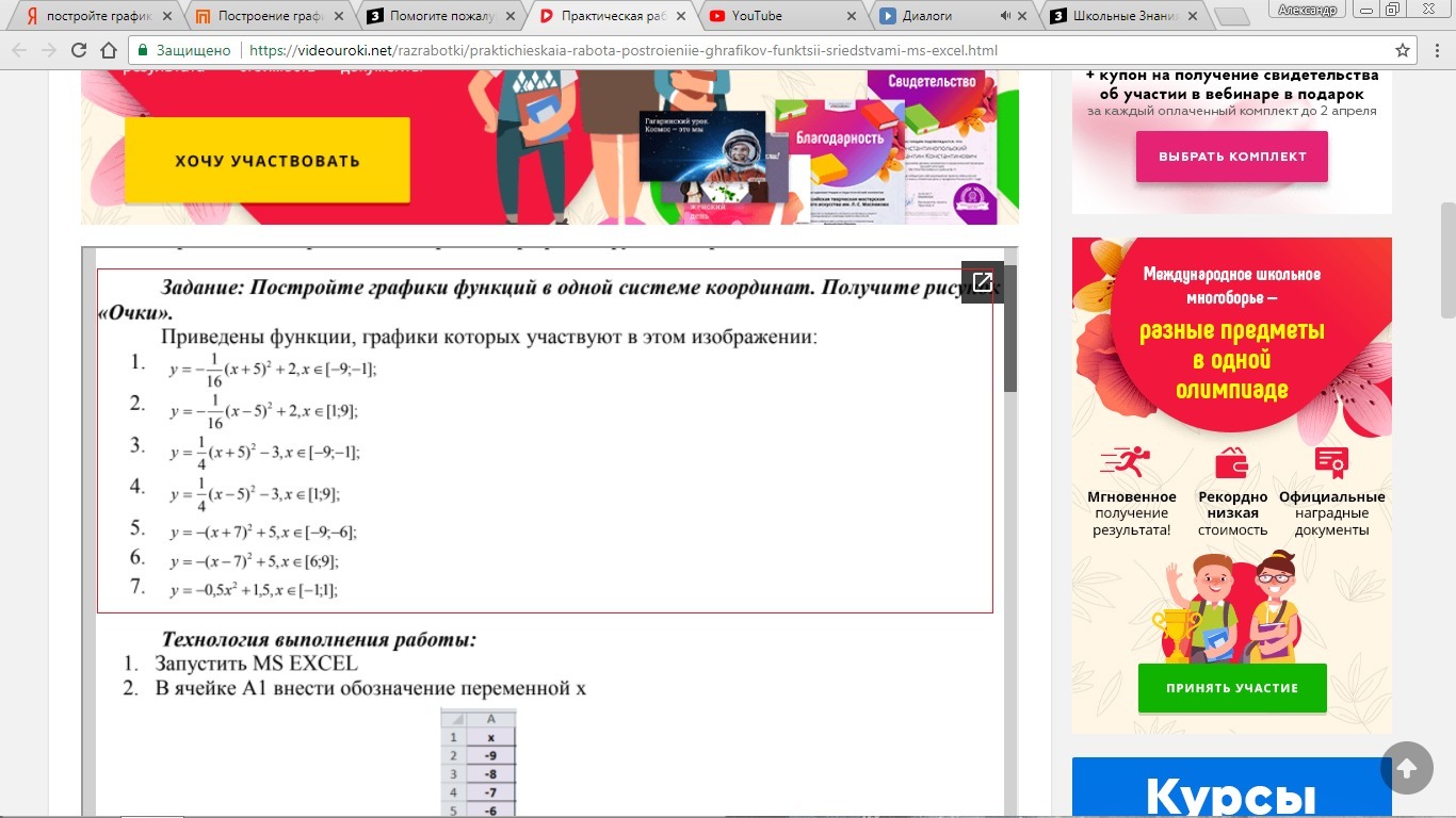 Помогите пожалуйста!! Программа Exel Задание: "Постройте графики функций в одной системе координат. Получи рисунок." «очки»