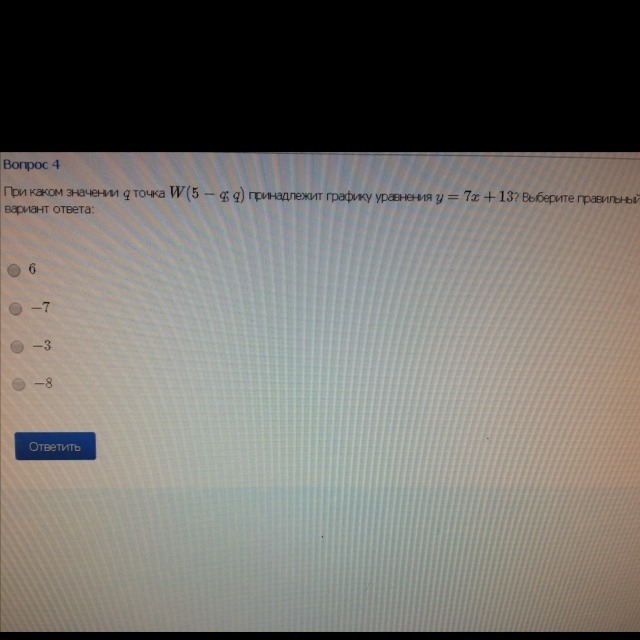 Чтобы точка W принадлежала данному графику, нужно, чтобы ее координаты x и y подходили в это уравнение. Подставим x = q - 5 и y = q в уравнение: