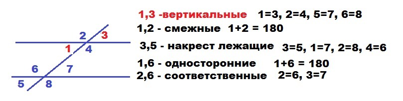 Названия углов образованных двумя параллельными и секущей - на рисунке в приложении.