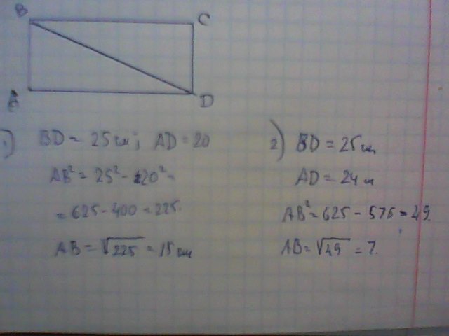 диагональ прямоугольника равна 25 см. найдите сторону прямоугольника если одна из его сторон равна :