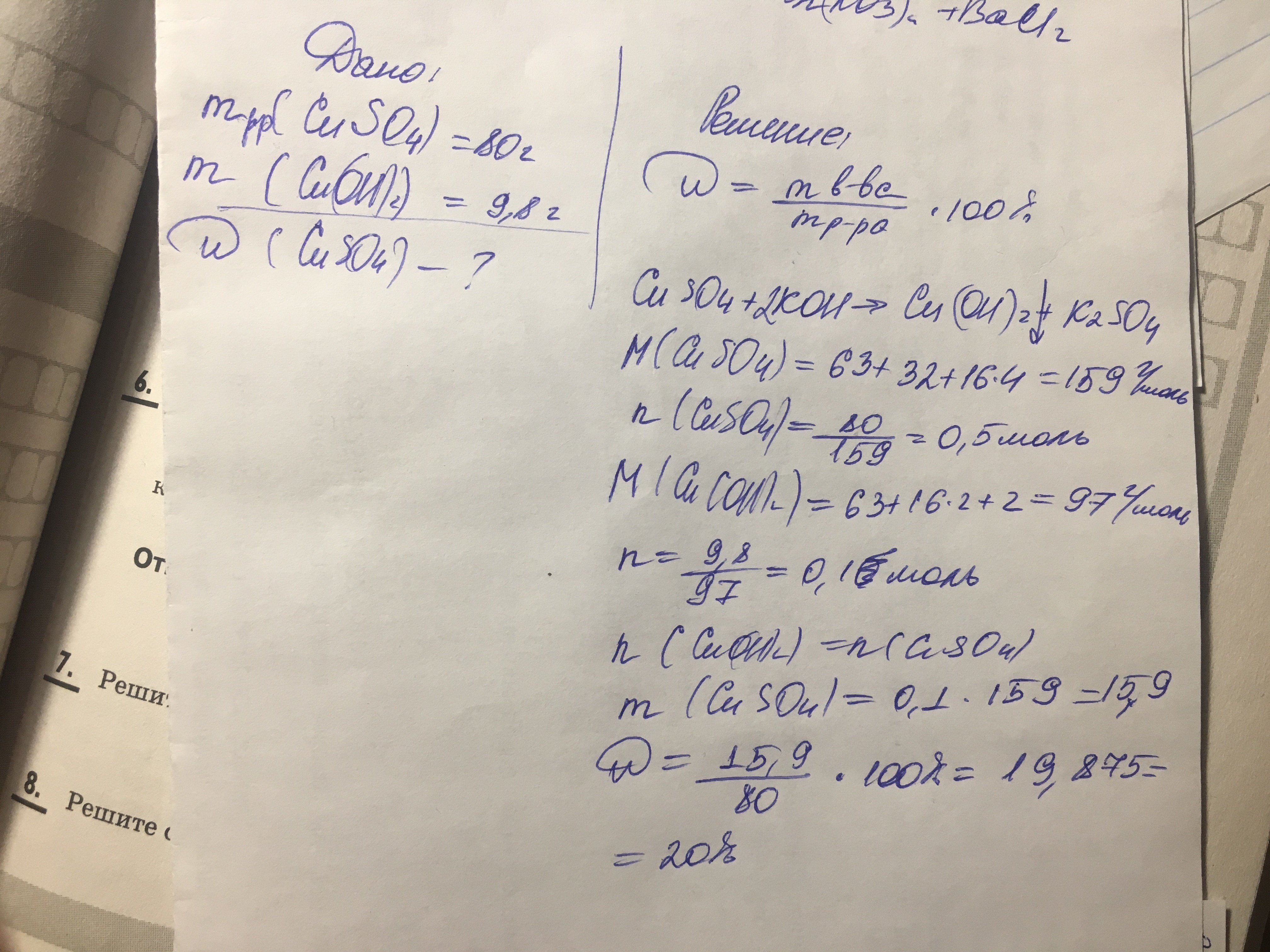 СРОЧНО!!! 80 г сульфата меди(2) смешали с избытком раствора гидроксида калия. Выпал осадок 9,8 г. Вычислите массовую долю соли в исходном растворе.