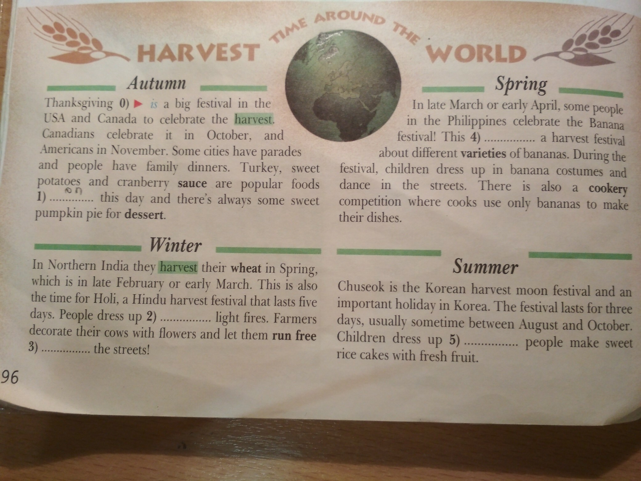 Spring Autumn Thanksgiing 0) - большой фестиваль в конце марта или в начале апреля(марта) люди, некоторые США и Канада, чтобы объединить лилии. Канадцы отмечают это в октябре, а в Филиппинах празднуют праздник Бананы! Это 4) американцы в ноябре. В некоторых городах есть парады о разных вариантах бананов. У людей и семейных обедов есть турки. сладкий tesival, childreu одеваются в костюмах, картофеле и мамбейрском соусе в популярной тарелке. В этот день также есть кулинария, где повара используют только бананы для пирога тыквы для мужчин на десерт. их rli hrs Winler В Северной инфелии есть Льеирская пшеница и весна, Лето в конце февраля или в марте кошки. Это также Chuseok - фестиваль корейской лунной луны и время, которое Холи, фестиваль урожая индуистов, который длится пять лет, Корея. Фестиваль длится три дня. Люди одеваются 2) пожары. Фермерские дни обычно иногда между августом и октубером. украсить своих коров с помощью wid atid пусть они бегут бесплатно Дети одевают людей, делают сладкие 3) улицы! рисовые лепешки с фруктовыми фруктами.