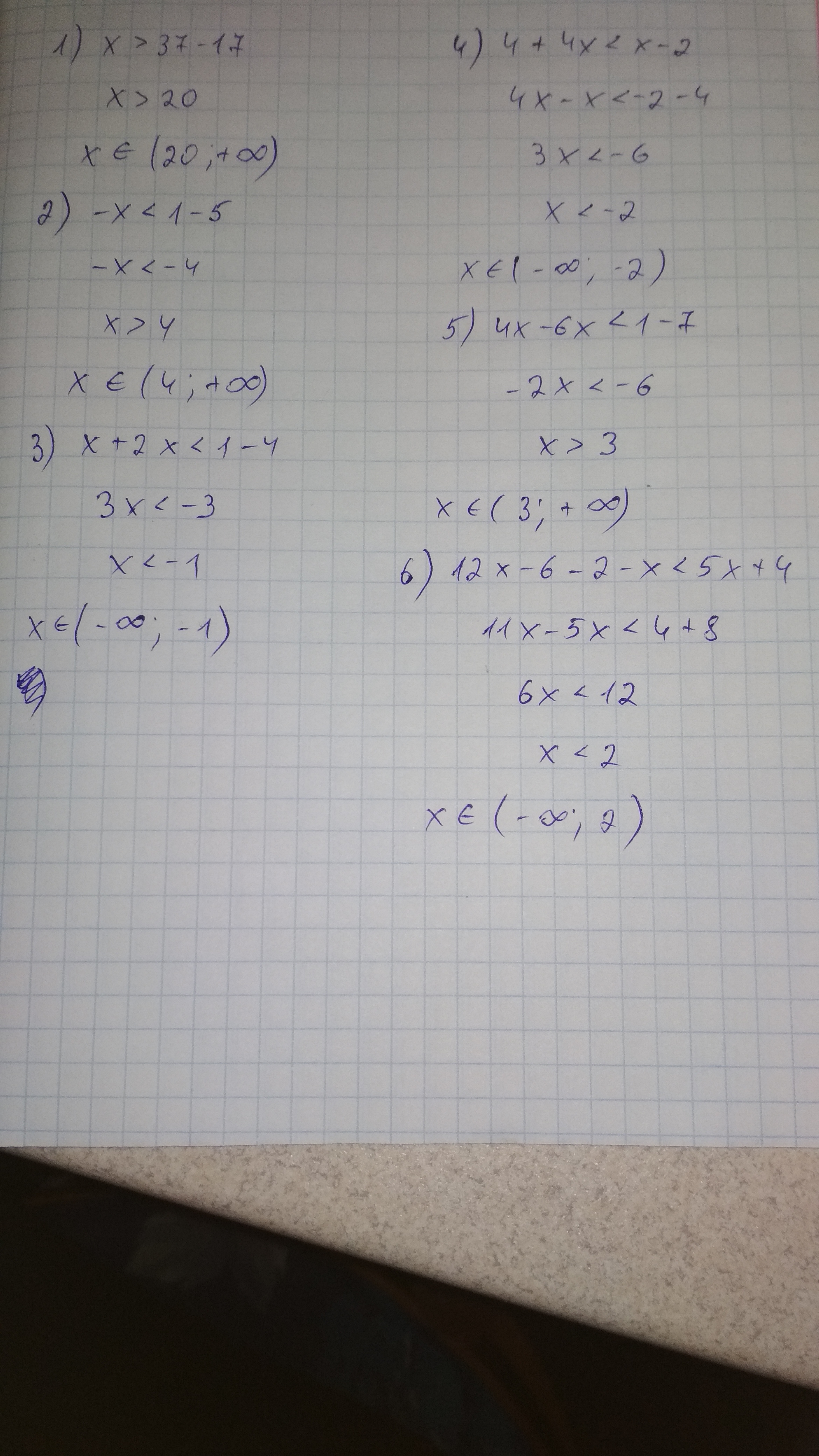 17+×>37 .5-×<1. 4+×<1-2×. 4+×<1-2×. 4(1+×)<×-2. 4×+7<6×+1. 6(2×-1)-(2+×)<5×+4. Дайте пожалуйста полное решение этих примеров