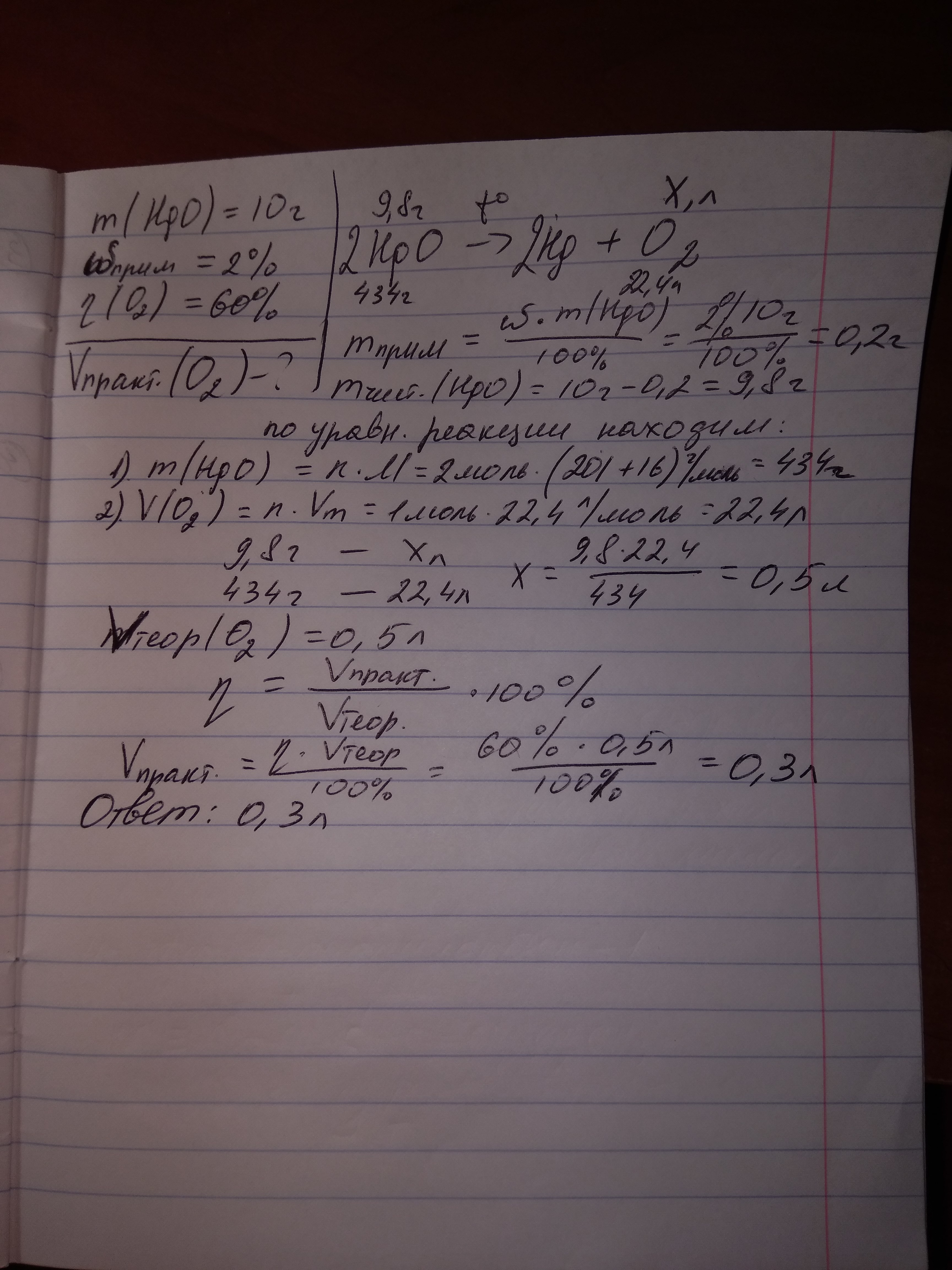 при разложении оксида ртути массой 10г. Содержащего 2% примесей. Вычислить объём кислорода, если выход продукта составил 60%