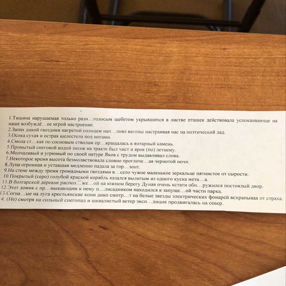 1. Тишина, нарушаемая только разноголосым щебетом укрывшихся в листве пташек, действовала успокаивающе на наше возбуждённое игрой настроение. 2. Запах дикой гвоздики, нагретой солнцем, наполнял вагоны, настраивая нас на поэтический лад. 3. Осока, сухая и острая, шелестела под ногами. 4. Смола, стекая по сосновым стволам, превращалась в янтарный камень. 5. Промытый снеговой водой песок на тракте был чист и ярок по-летнему. 6. Молчаливый и угрюмый по своей натуре Яков с трудом выдавливал слова. 7. Некоторое время высота безмолвствовала, словно проглоченная чернотой ночи. 8. Луна, огромная и уставшая, медленно падала за горизонт. 9. На стене, между тремя громадными гвоздями, висело чужое маленькое зеркальце, пятнистое от сырости. 10. Покрытый серо-голубой краской корабль казался вылитым из одного куска металла. 11. В болгарской деревне, расположенной на южном берегу Дуная, очень кстати обнаружился постоялый двор. 12. Это домик, с примыкающим к нему палисадником, находился в запущенной части парка. 13. Согнанные на луга крестьянские кони дико смотрят на белые звёзды электрических фонарей, всхрапывая от страха. 14. Несмотря на сильный снегопад и шквалистый ветер, экспедиция продвигалась на север.