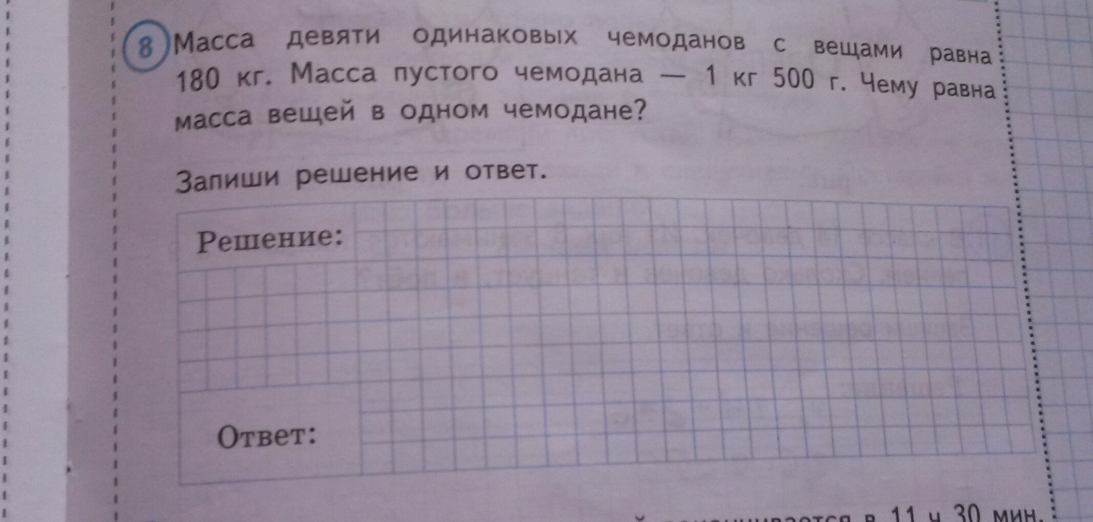 Ответ: Масса вещей в одном чемодане равна 18 кг. 500 г.