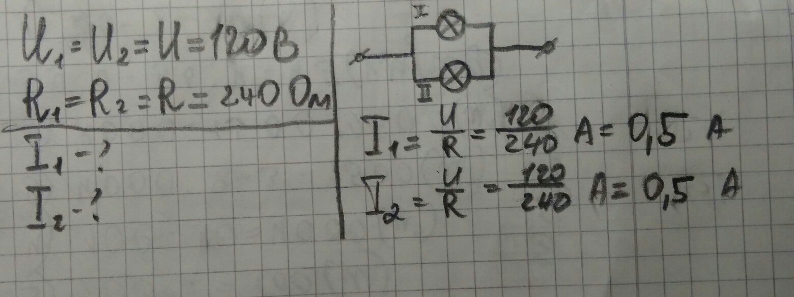 ПОЖАЛУЙСТА ОЧЕНЬ НАДО!!! Напруга в мережі складає 120В. Опір кожної з двох електричних ламп, які з'єднанні паралельно та підклюз до мережі, складає 240 Ом. Встановити силу струму в кожній лампі.