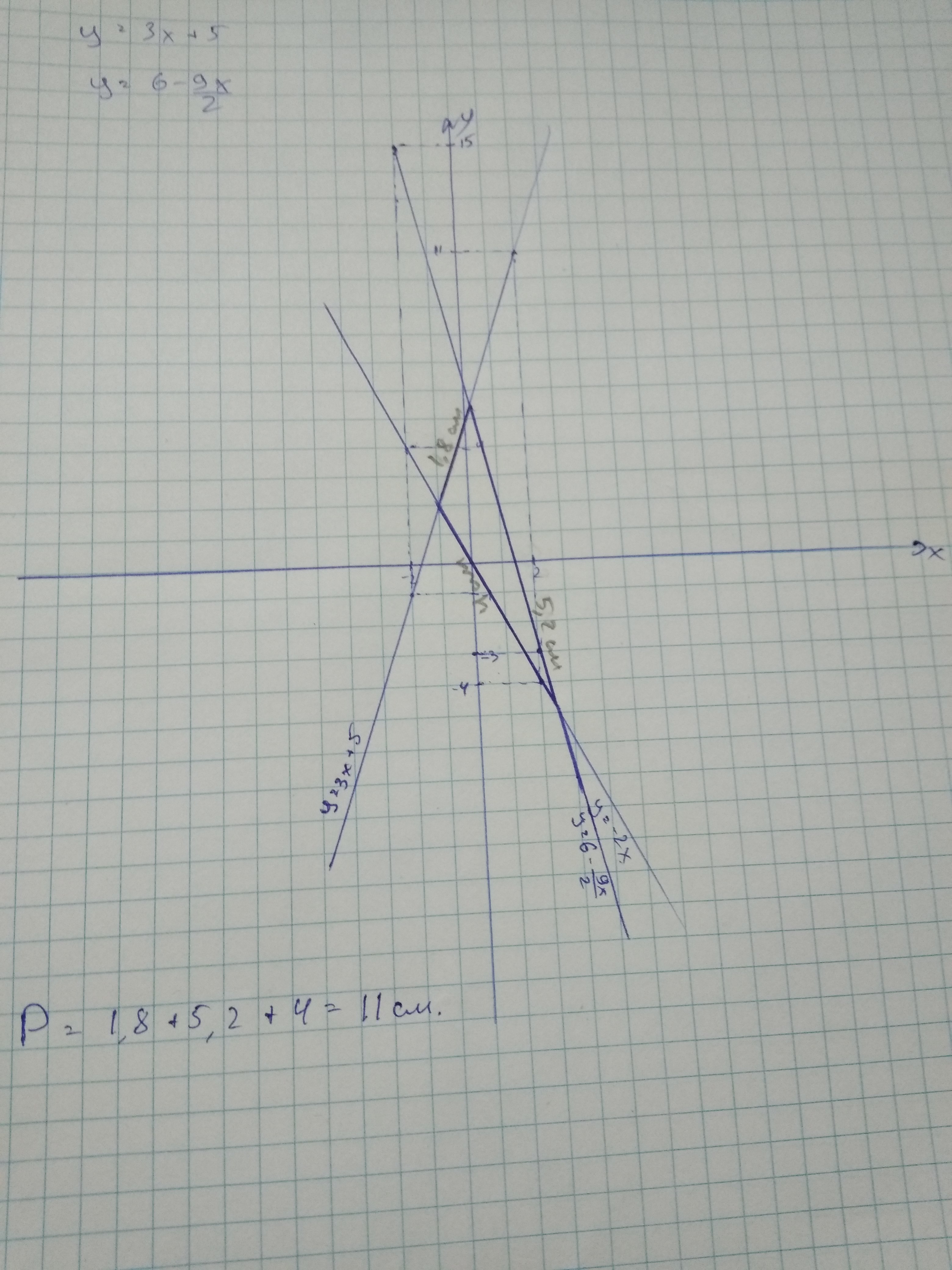 Построить на одной координатной плоскости графики трёх функций:у= -2х, у=3х+5 и у=6-9х/2.Выделите треугольник,полученный в результате попарного пересечения этих графиков,определить его вид и найти периметр измерив стороны.ПОМОГИТЕ ПОЖАЛУЙСТА.ЭТО СРОЧНО!БАЛЛЫ НЕ ПРОБЛЕМА.