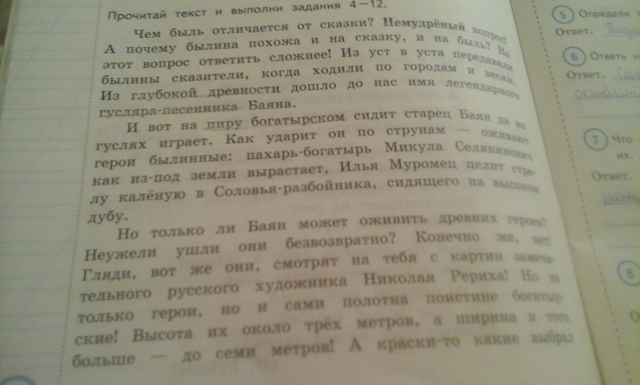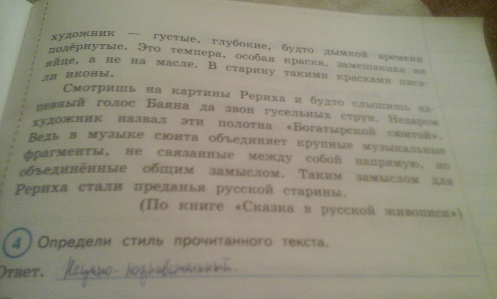 Эпитеты в тексте: немудрёный вопрос, глубокая древность, легендарный гусляр-песенник, былинные герои, пахарь-богатырь, древние герои, замечательный художник, поистине богатырские полотна, краски густые, глубокие, будто дымкой времени подёрнутые; напевный голос, "Богатырская сюита".