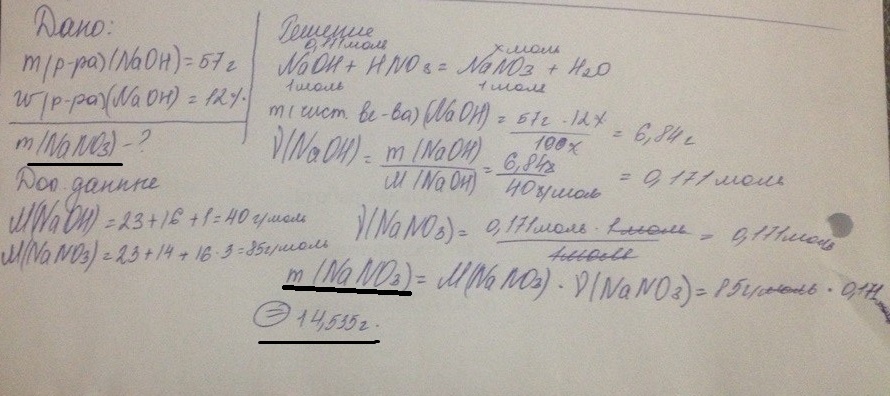 Найти массу соли, которая образуется при нейтрализации 57 г 12% -ного раствора гидроксида натрия раствором азотной кислоты