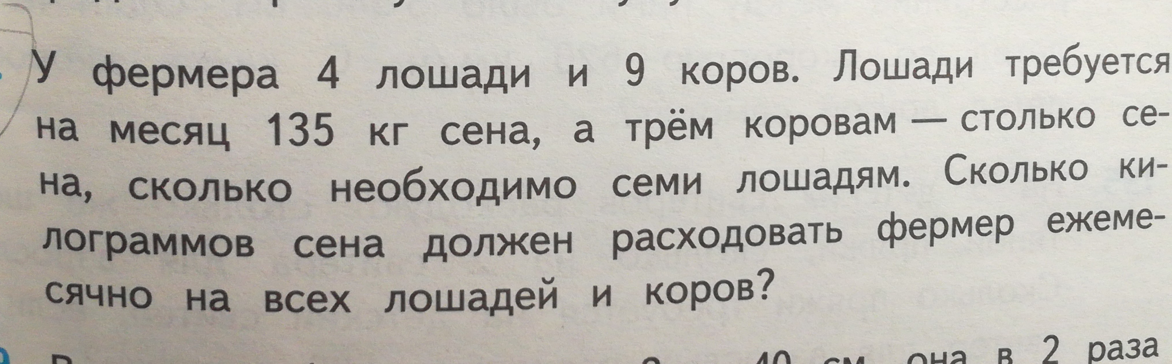 у фермера 4 лошади и 9 коров лошади требуется на месяц 135 кг сена а трём коровам столько сена Сколько необходимо 7 лошадям Сколько килограммов сена должен расходовать фермер ежемесячно на всех лошадей коров