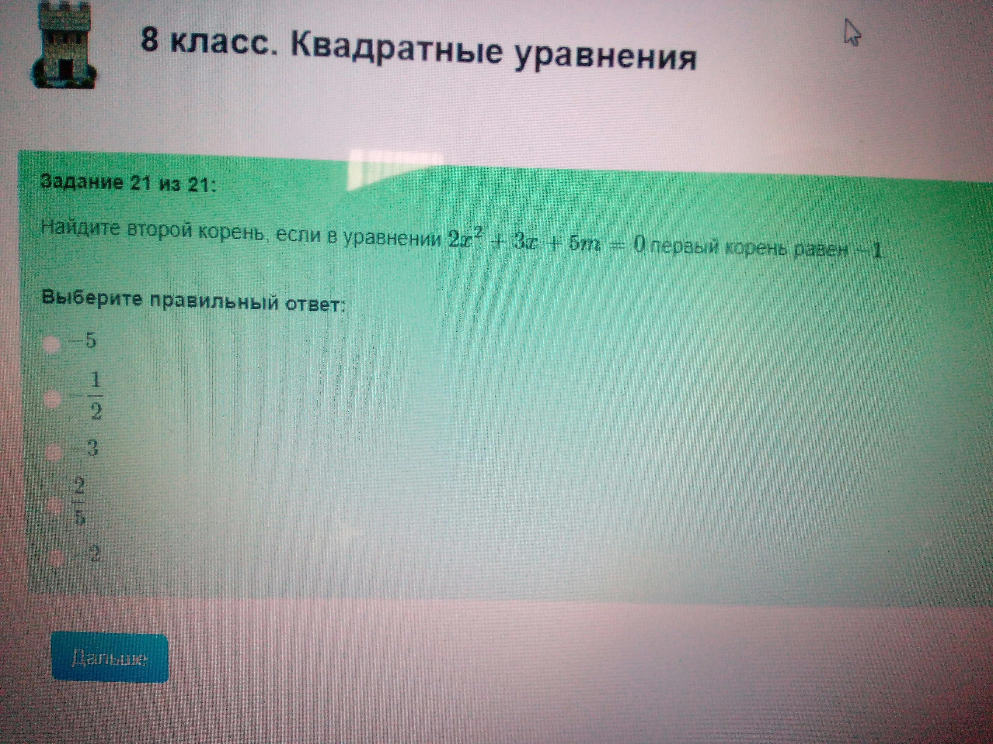 НАЙДИТЕ КОРЕНЬ ЕСЛИ УРАВНЕНИЕ 2Х2+3Х+5М=0 ПЕРВЫЙ КОРЕНЬ -1