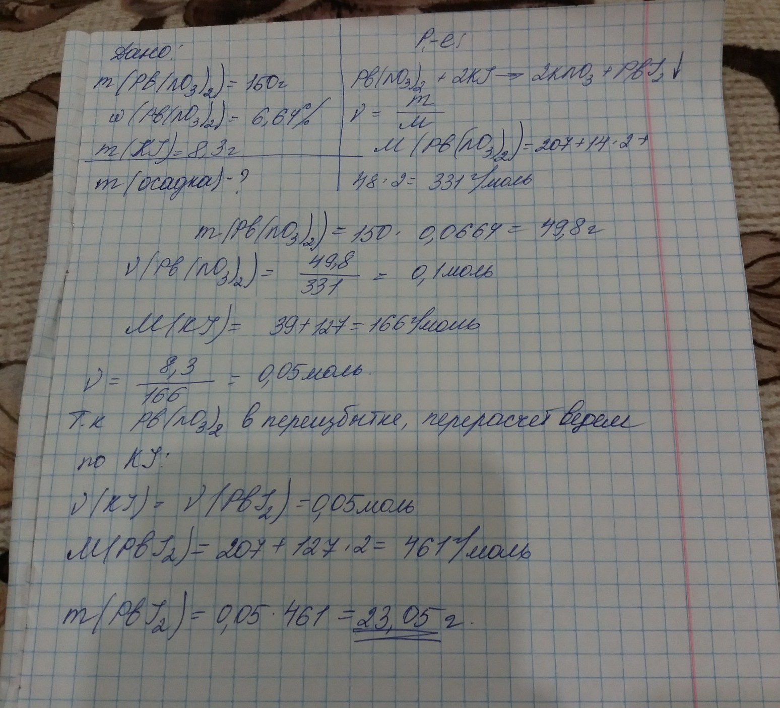 При взаимодействии 150 г раствора нитрата свинца (массовая доля соли 6,64%) с иодидом калия массой 8,3 г. Рассчитайте массу осадка