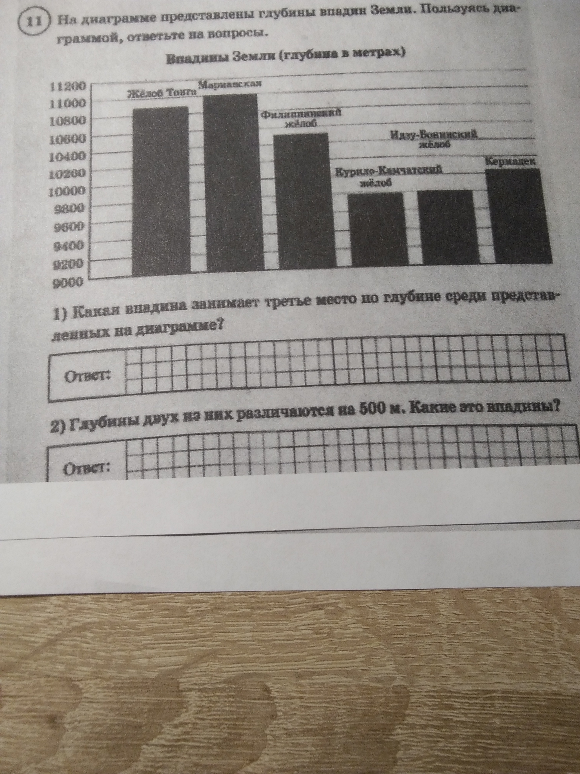 На диаграмме представлены глубины впадины Земли. Пользуясь диаграммой, ответьте на вопросы.