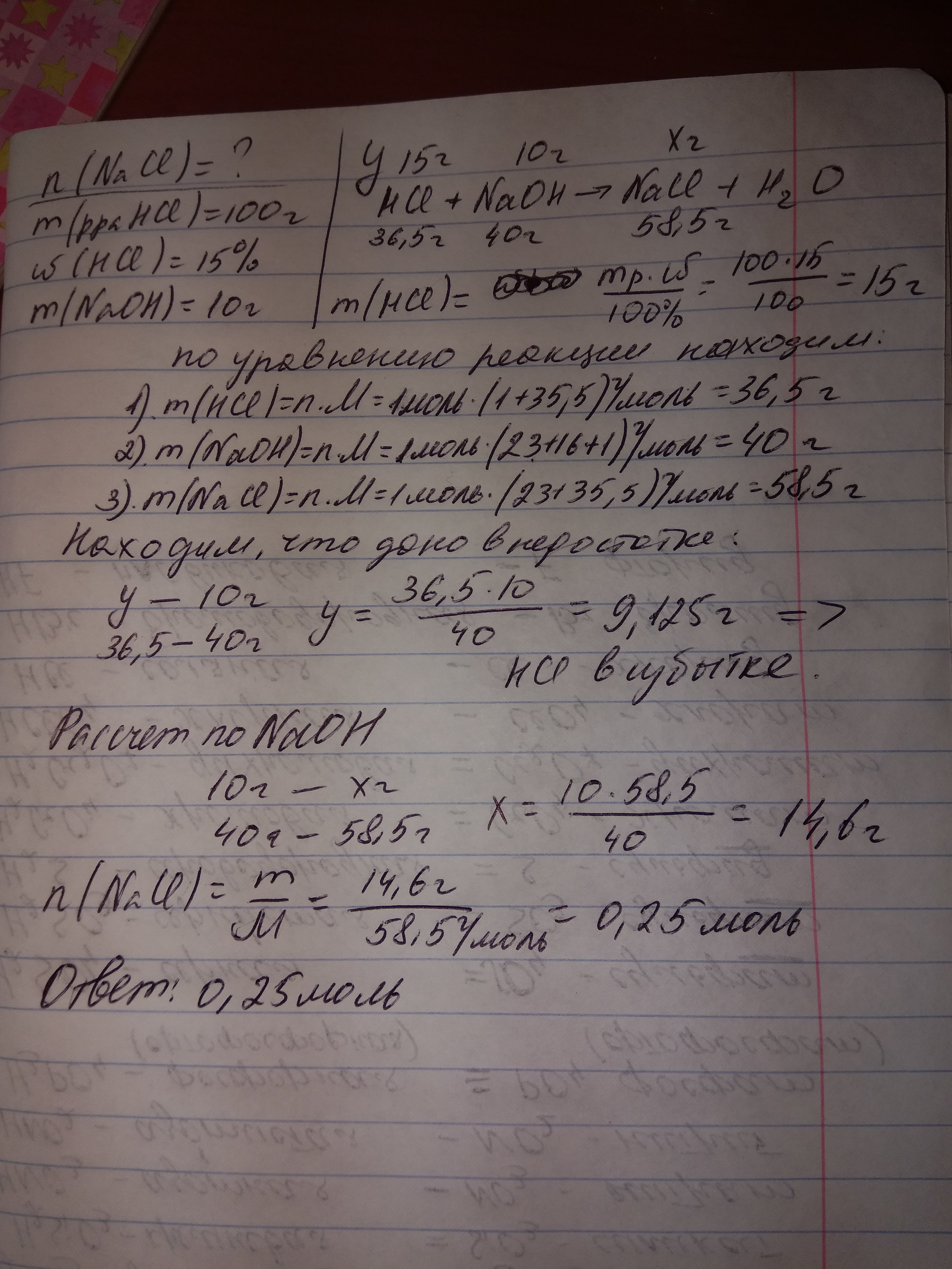 Какое кол во вещества хлорида натрия может получиться если к 100 г раствора соляной кислоты с массовой долей хлороводорода 15% добавили 10 г гидроксида натрия