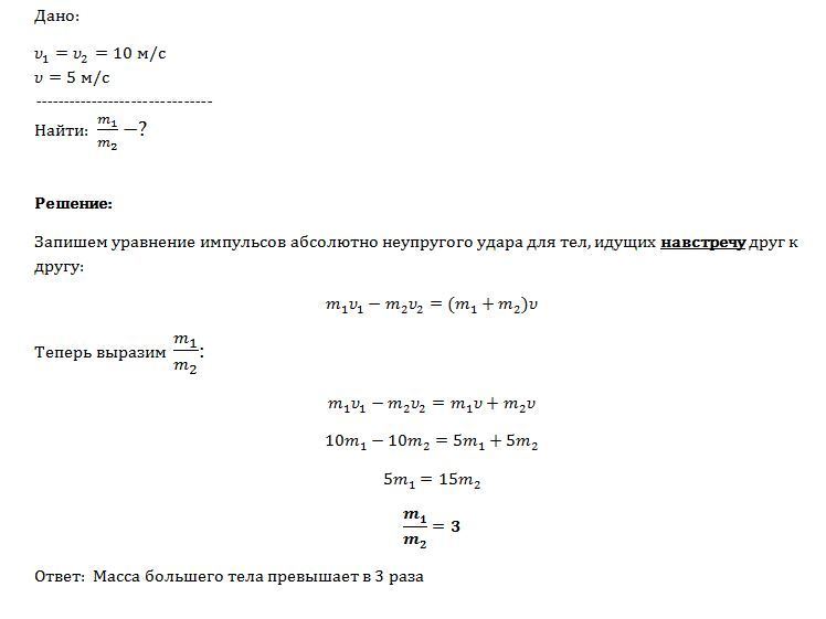 два тела разных масс движутся навстречу друг другу с одинаковыми скоростями 10 м/с. после абсолютно неупругого удара скорость их движения оказалась 5 м/c. во сколько раз масса большего тела превышает массу меньшего?