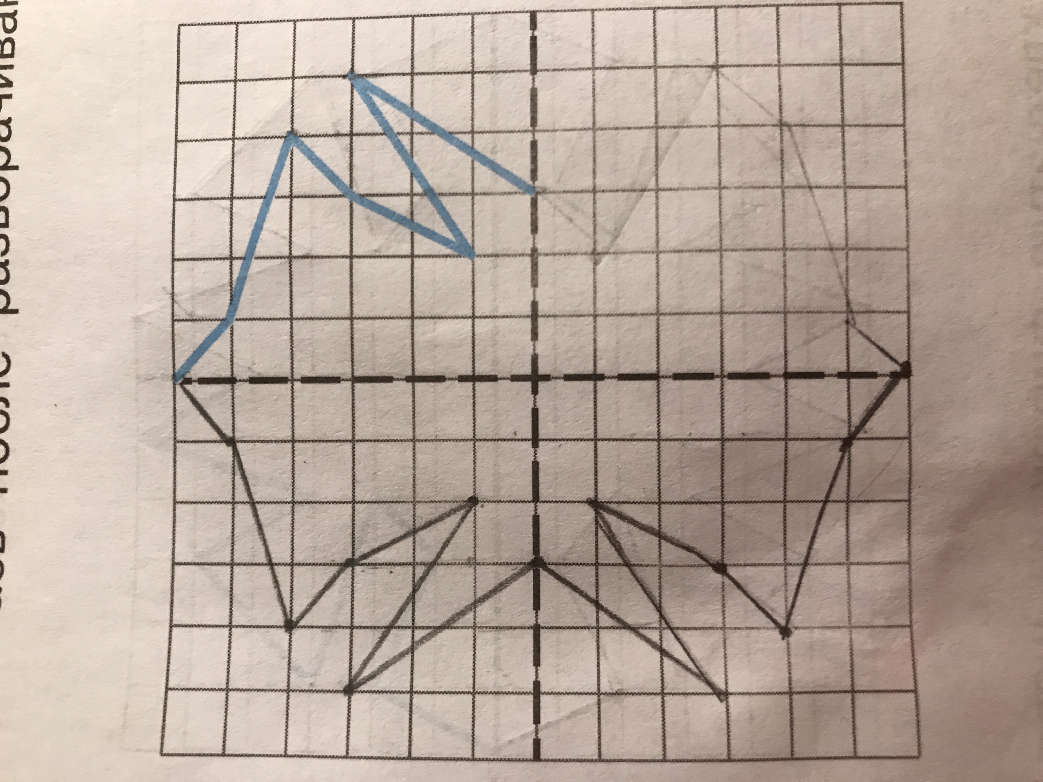 Квадратный лист бумаги сложили пополам и ещё раз пополам, затем разрезали по нарисованной линии и развернули. Нарисуй, какая фигура получилась после разворачивания,-продолжи линии на рисунке.