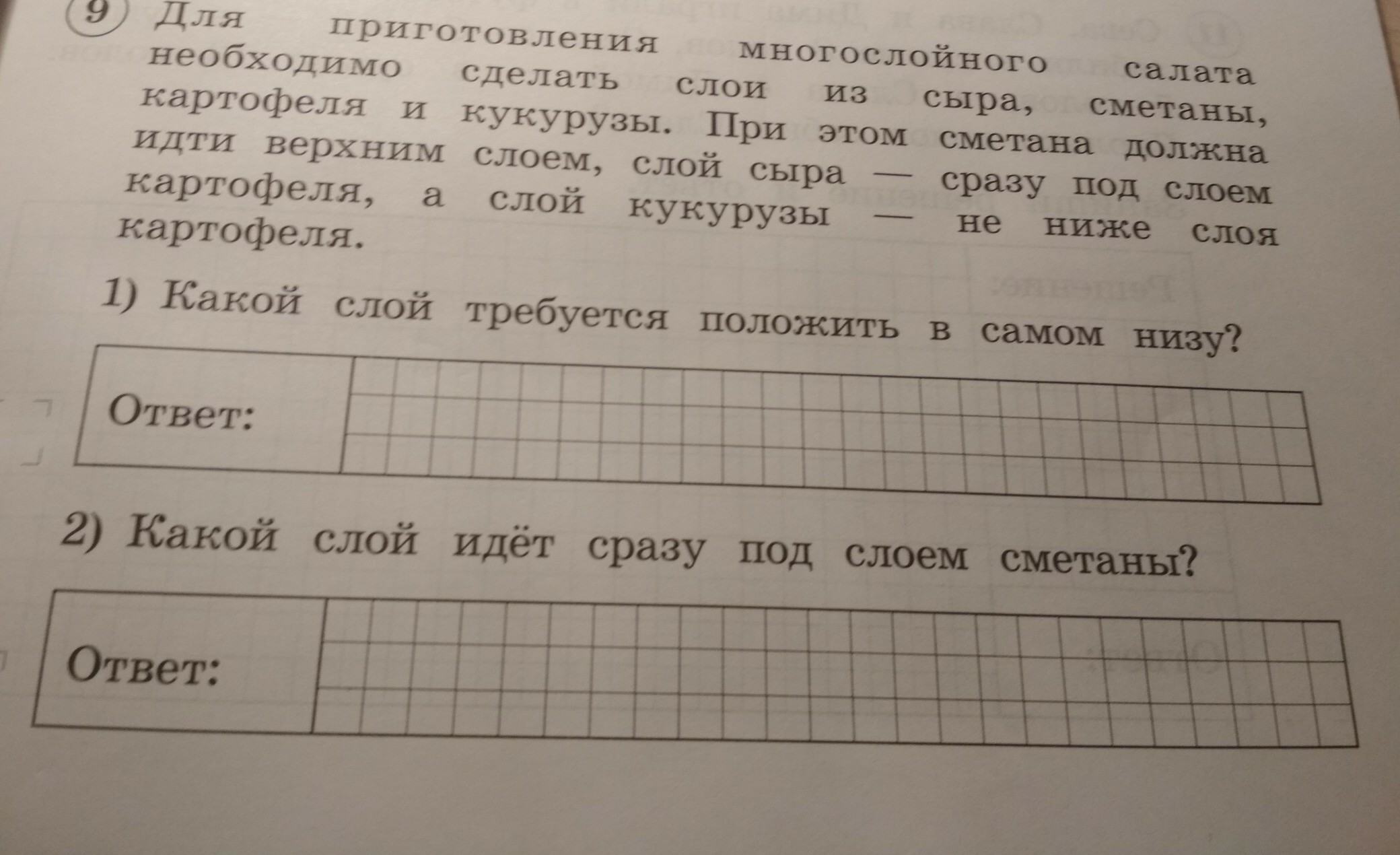 для многослойного салата необходимо сделать слои из сыра сметаны картофеля и кукурузы задачи решите!!!!!!плиз!!!