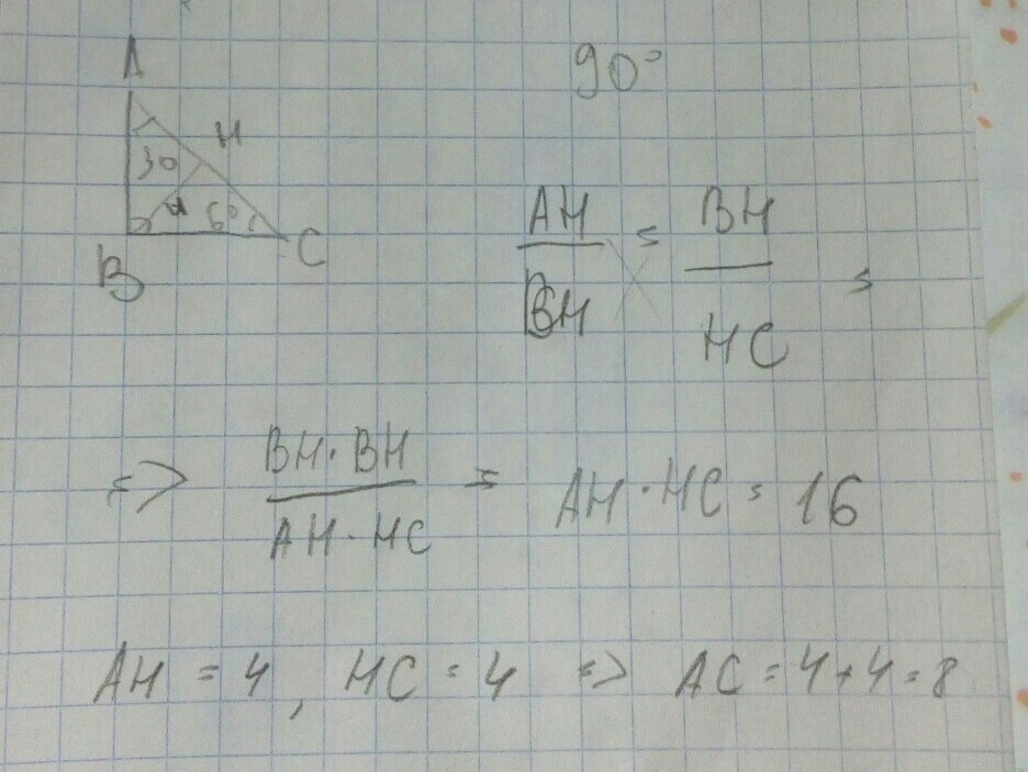в треугольнике авс угол a равен 30 градусов, угол c равен 60 градусов, высота BH равна 4 см. Найти AC
