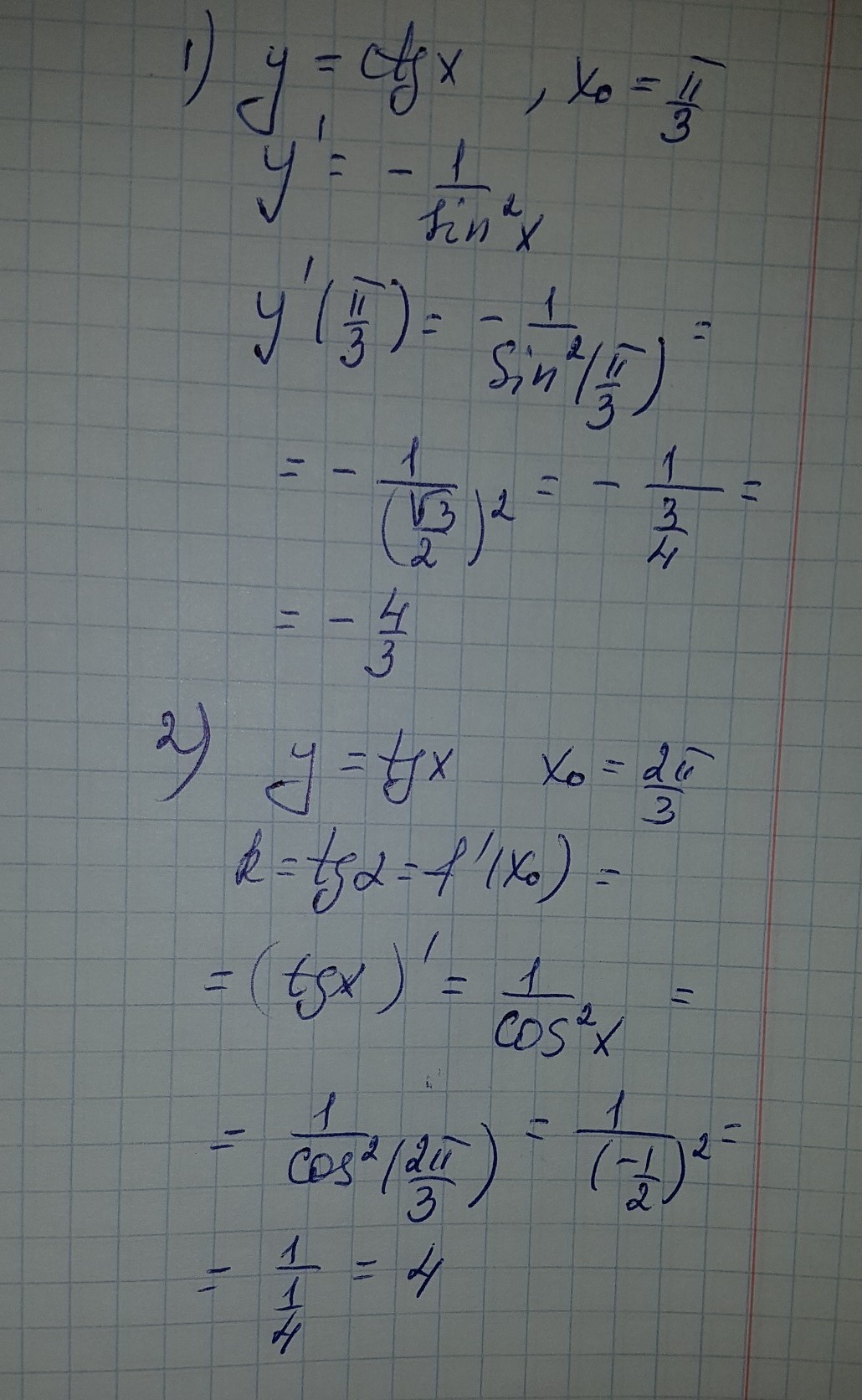 1)Найдите значение производной функции y=ctg x в точке x0=пи/3