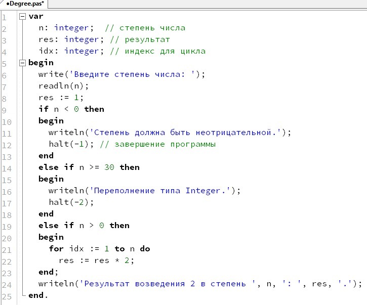 writeln('Результат возведения 2 в степень ', n, ': ', res, '.');