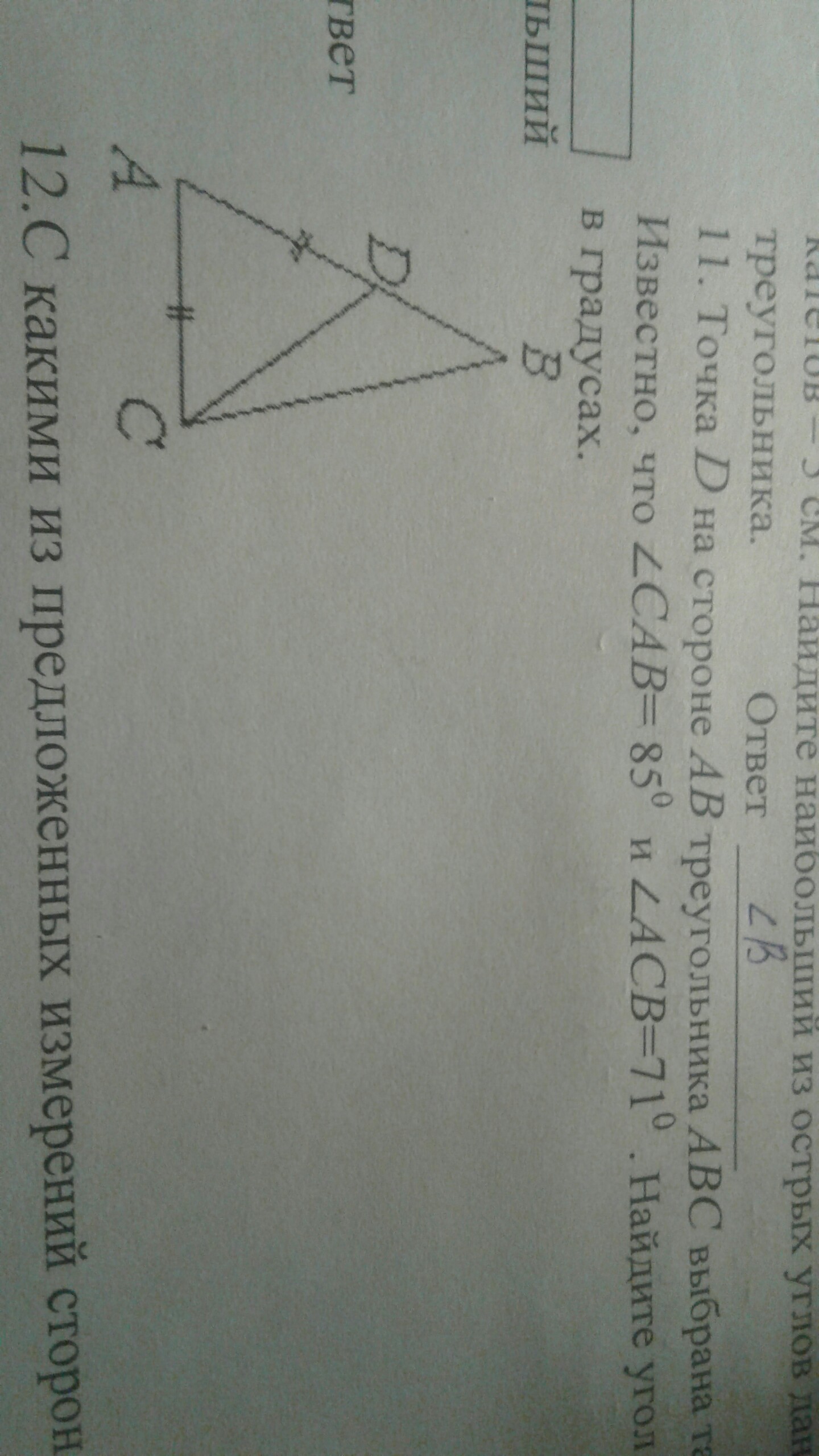 точка D на стороне AB треугольника ABC выбрана так , что угол CAB =85 градусов и угол ACB =71 градус . Найдите угол DCB . Ответ дайте в градусах .