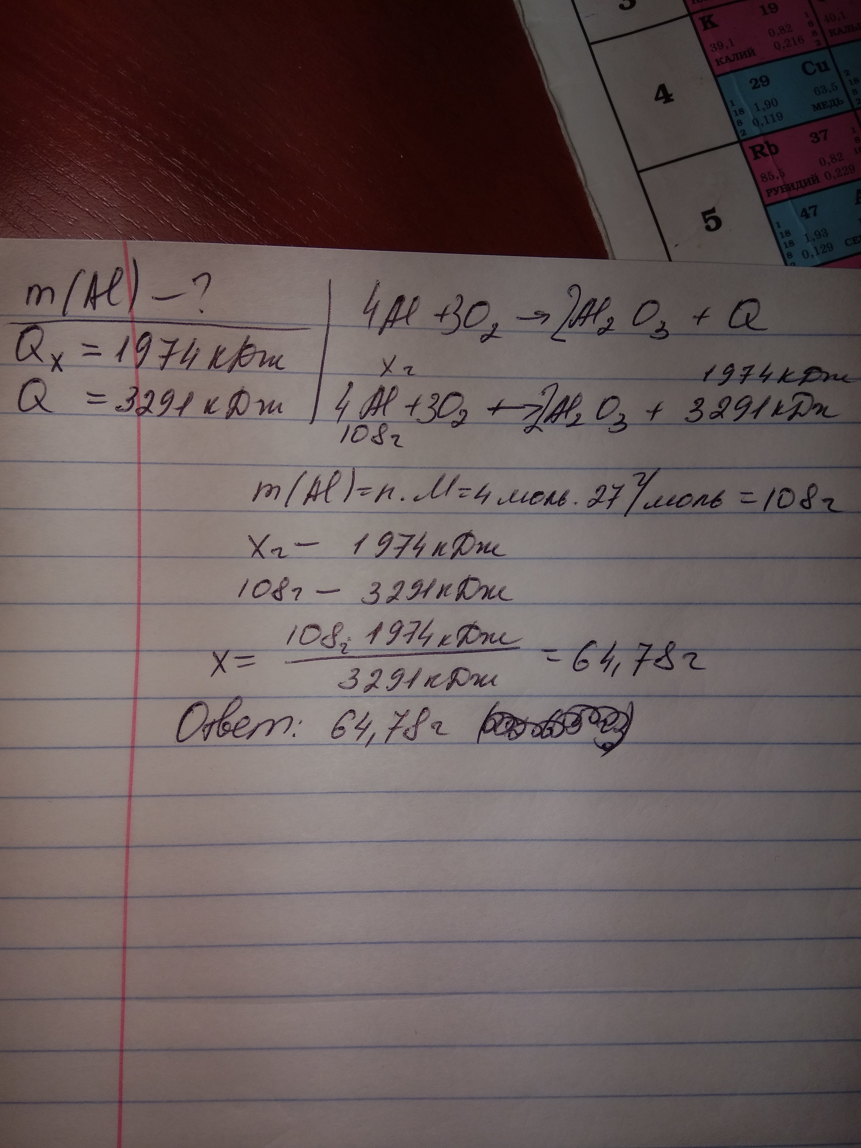 какая масса алюминия сгорела если известно что при этом образовался оксид алюминия и выделилось 1974 кДж теплоты ? ттепловой эффект реакции 3291 кДж
