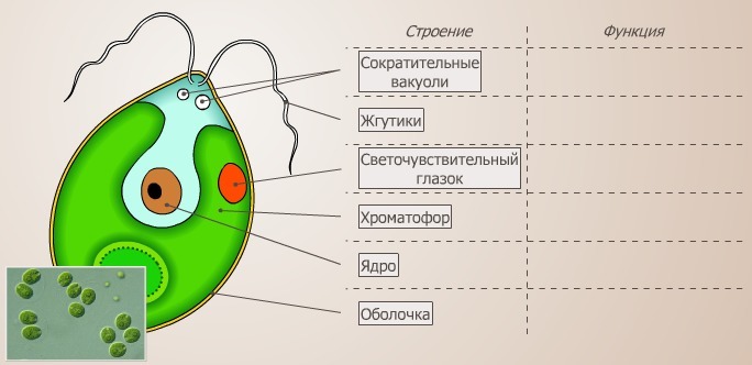 3) Дать сравнительную характеристику строению изученных организмов. Задание 1.( Рисунок с подписью)Жгутики, ядро, светочувствительный глазок, сократительные вакуоли, хроматофор, оболочка, цитоплазма. Задание №2.(Перечертите таблицу.) ( Картинка ✓2)Заполните её, используя ниже предлагаемые варианты, добавив их на правильные места в таблице.