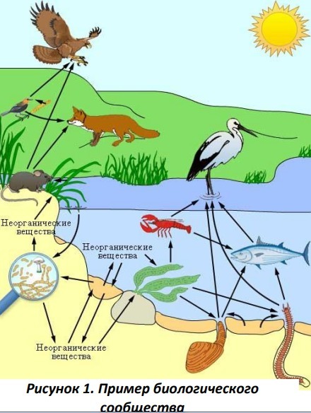 Рассмотрите рисунок 1 и на приведенных примерах опишите поток энергии в биоценозах. Укажите возможные трофические цепи по приведенному рисунку. Назовите представителей различных трофических групп. Сможет ли существовать изображенное сообщество, если погибнут все продуценты?
