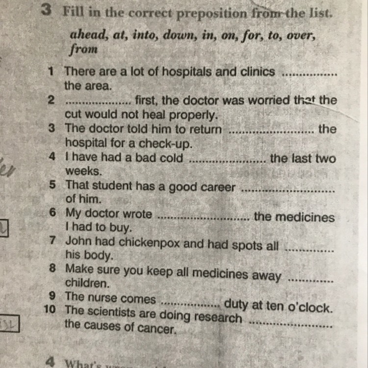 1 in 2 at 3 to 4 for 5 ahead 6 down 7 over 8 from 9 on 10 into