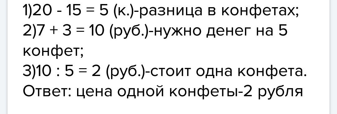 Слава собирался купить 20 конфнет, но ему не хватало для этого 3 руб. Тогда Слава купил 15 конфет, и у него осталось 7 руб сдачи. Сколько стоит одна конфета.