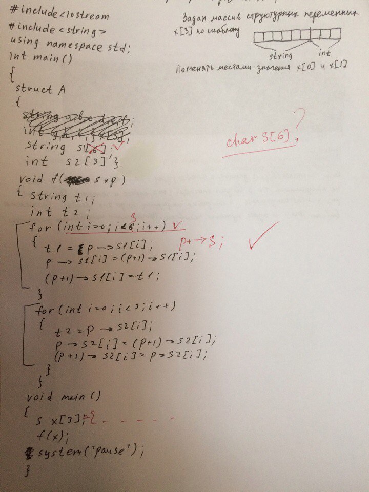 Задание: задан массив структурных переменных x[3] по шаблону. Поменять местами значения x[0] и x[1]. Рисунок на картинке (в правом углу)