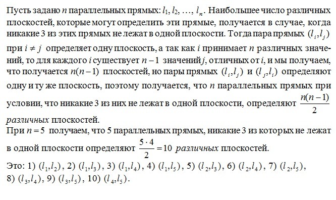 Скільки різних площин можуть визначити 5 заданих паралельних прямих.Обґрунтуйте відповідь шляхом перерахування цих площин.
