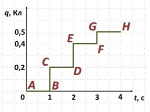 Используя данные, приведенные на графике зависимости заряда, проходящего через поперечное сечение проводника, от времени, определи, в течение какого промежутка времени магнитное поле, возникающее вокруг проводника, было максимальным; не существовало вовсе.