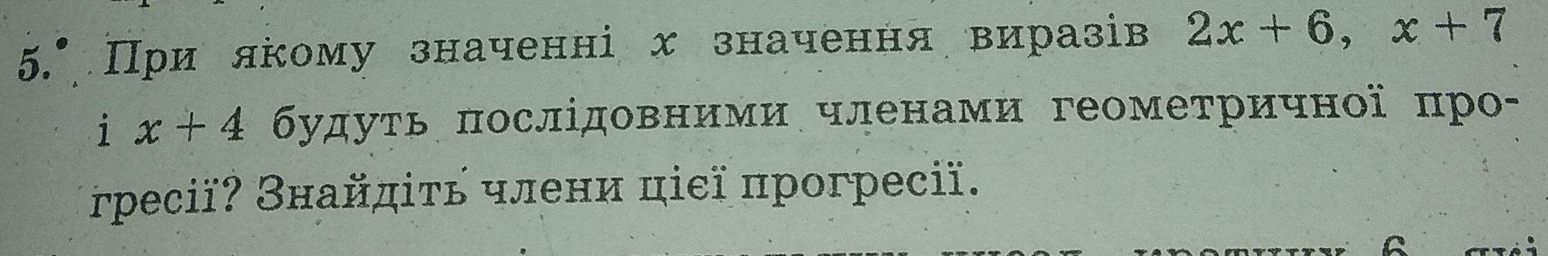 При якому значенні х значення виразів 2х+6 х+7 х+4 будуть послідовними сленами геометричної прогресії? знайдіть члени ціеї прогресії
