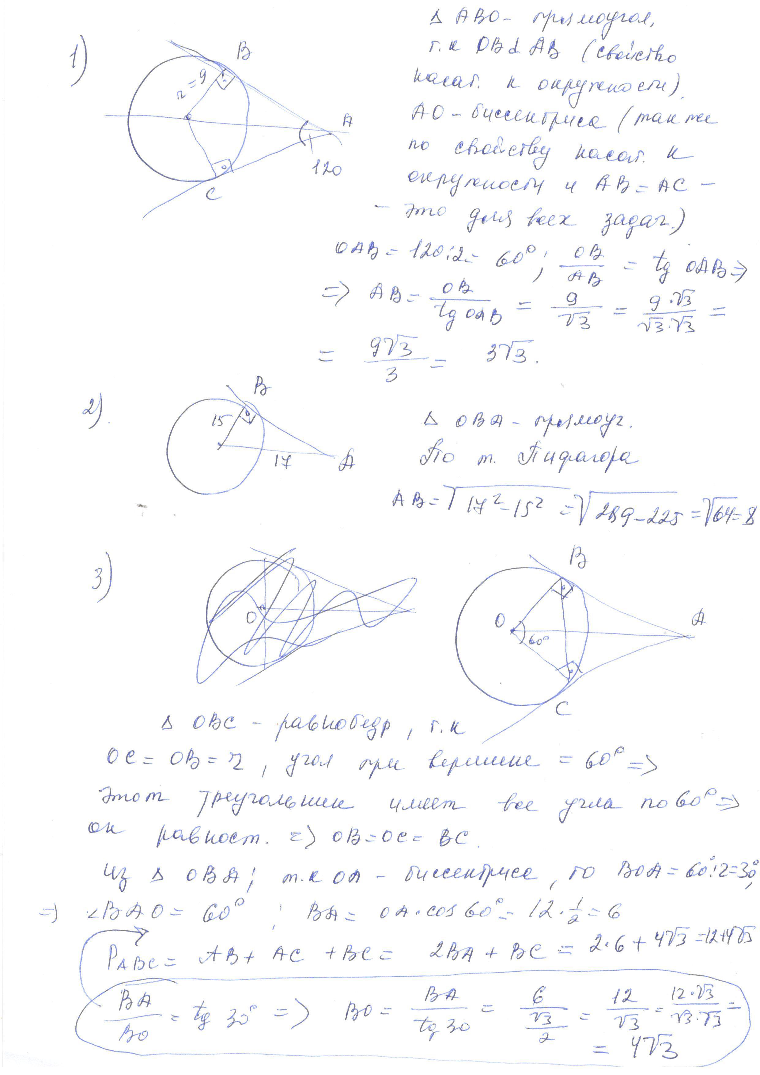 Номер 1.найдите отрезки касательных АВ и АС, проведённых из точки А к окружности радиуса r, если r=9 см, угол ВАС=120 градусов (фотография решения)