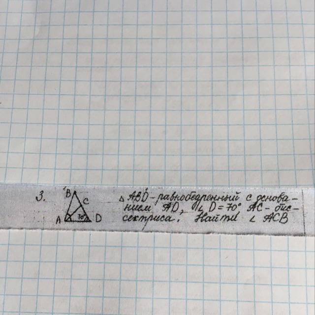 Треугольник ABD- равнобедренный с основанием AD, угол D = 70 градусов, AC -биссектриса. Найти: угол АСВ