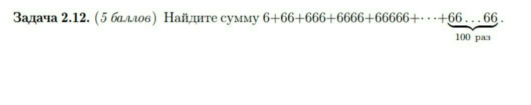 Число, записываемое с помощью К девяток, равно (10К-1), следовательно, число, записываемое с помощью К шестерок, равно 6(10К-1)/9=2(10К-1)/3. Поэтому сумма 6+66+666+...+666..6 равна 2/3((10-1)+(102-1)+...+(10Н-1)) = 2/3((10+102+...+10Н) -Н) . Во внутренних скобках стоит геометрическая прогрессия. Ее сумма равна 10+102+...+10Н = (10Н+1-10)/9. Итак, окончательно получаем, что исходная сумма равна 2(10Н+1-10)/27-2Н/3.Буква Н ЭТО КАК АНГЛИЙСКАЯ ПРОСТО НЕ ПРИНИМАЮТСЯ НА АНГЛИЙСКОМ