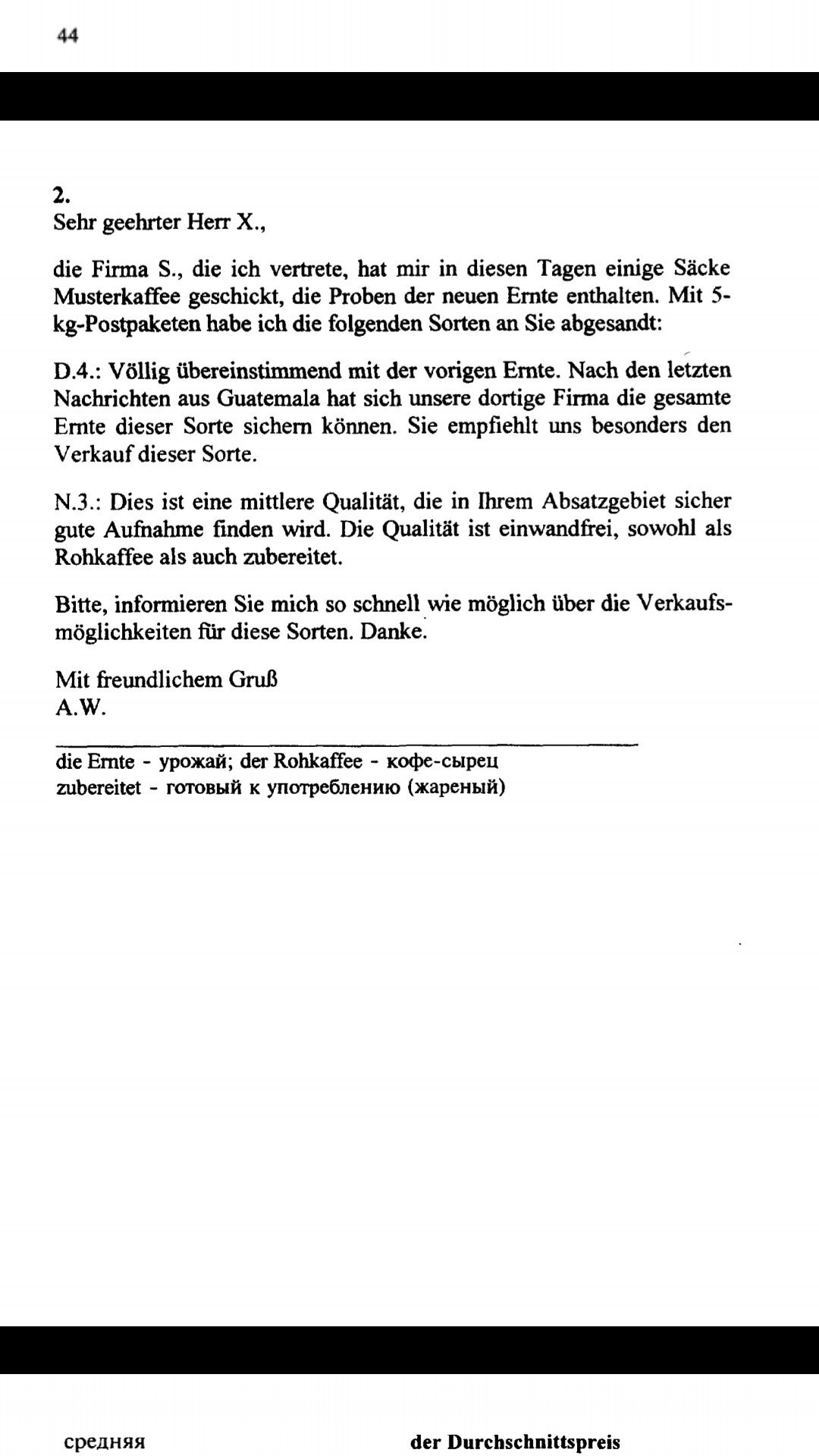 D.4: Полностью совпадает с прошлогодним урожаем. По последним сообщениям из Гватемалы, наша, находящаяся там фирма, может полностью гарантировать весь урожай данного сорта. Она особенно рекомендует нам сбыт этого сорта кофе.