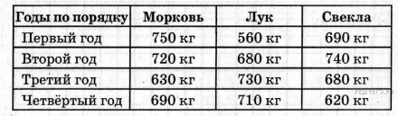 Пётр Иванович выращивает морковь, лук и свеклу. Каждый овощ он выращивал на отдельном участке в течении четырёх лет. Пётр Иванович заносит в таблицу количество килограммов урожая, которое он получает с каждого участка за год. Используя таблицу, ответь на вопросы. Урожайность какого овоща была наибольшей за второй год?