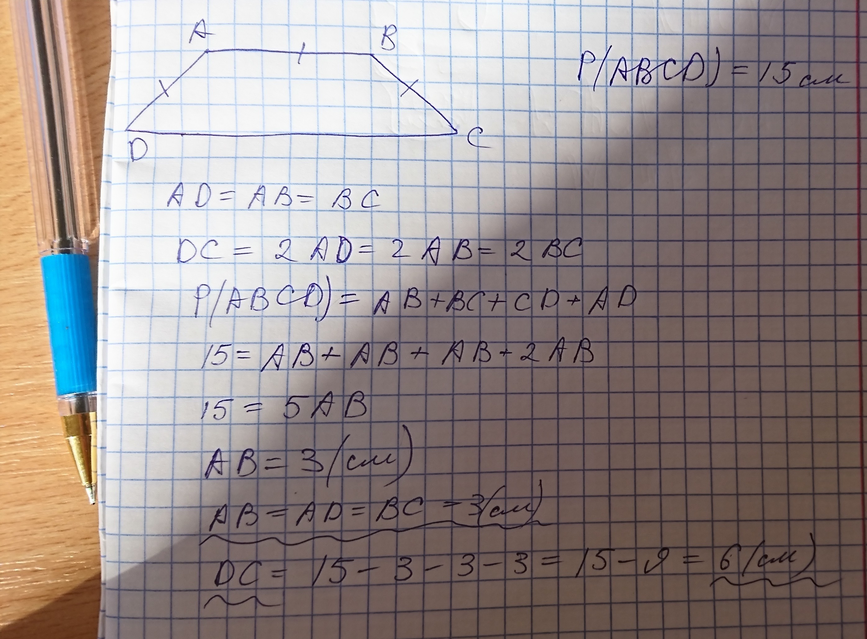 периметр трапеции равен 15 см. Найти стороны данной трапеции если её боковые стороны равны между собой и равны меньшему основанию, а большее основание вдвое их длиннее