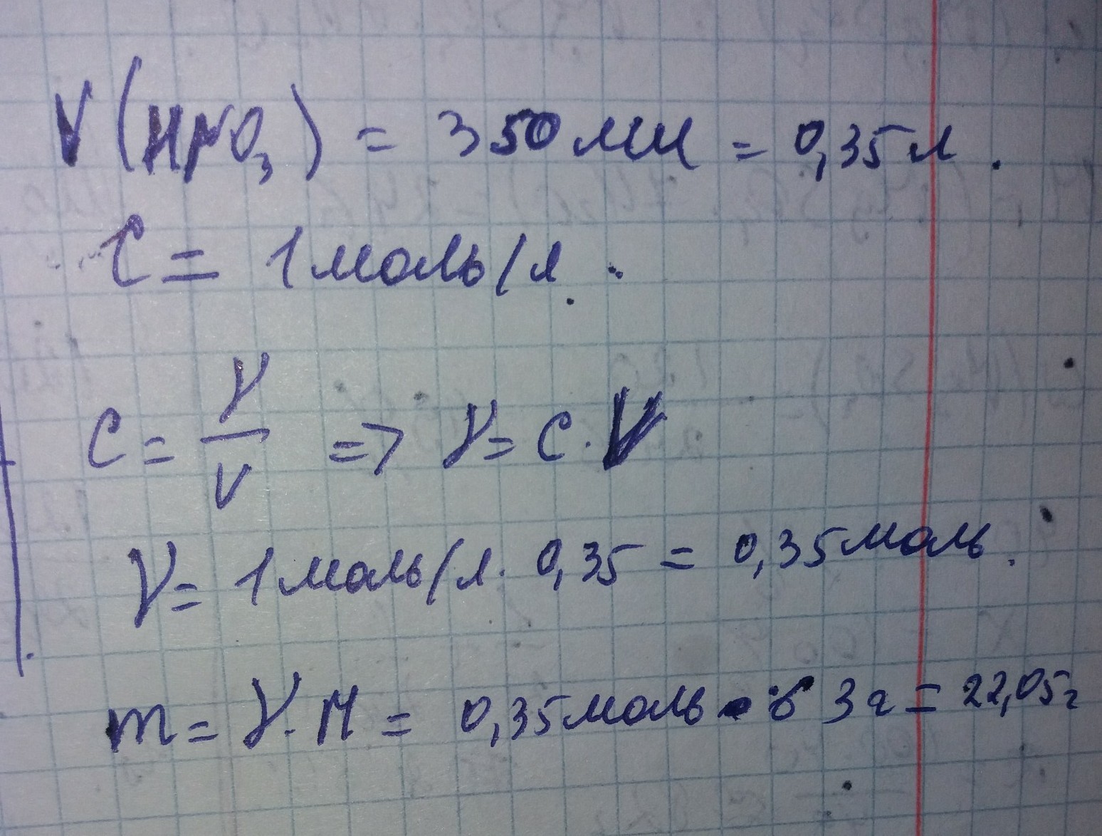 Вычислить массу азотной кислоты, содержащегося в растворе объемом 350мл, если его молярная концентрация 1 моль/л