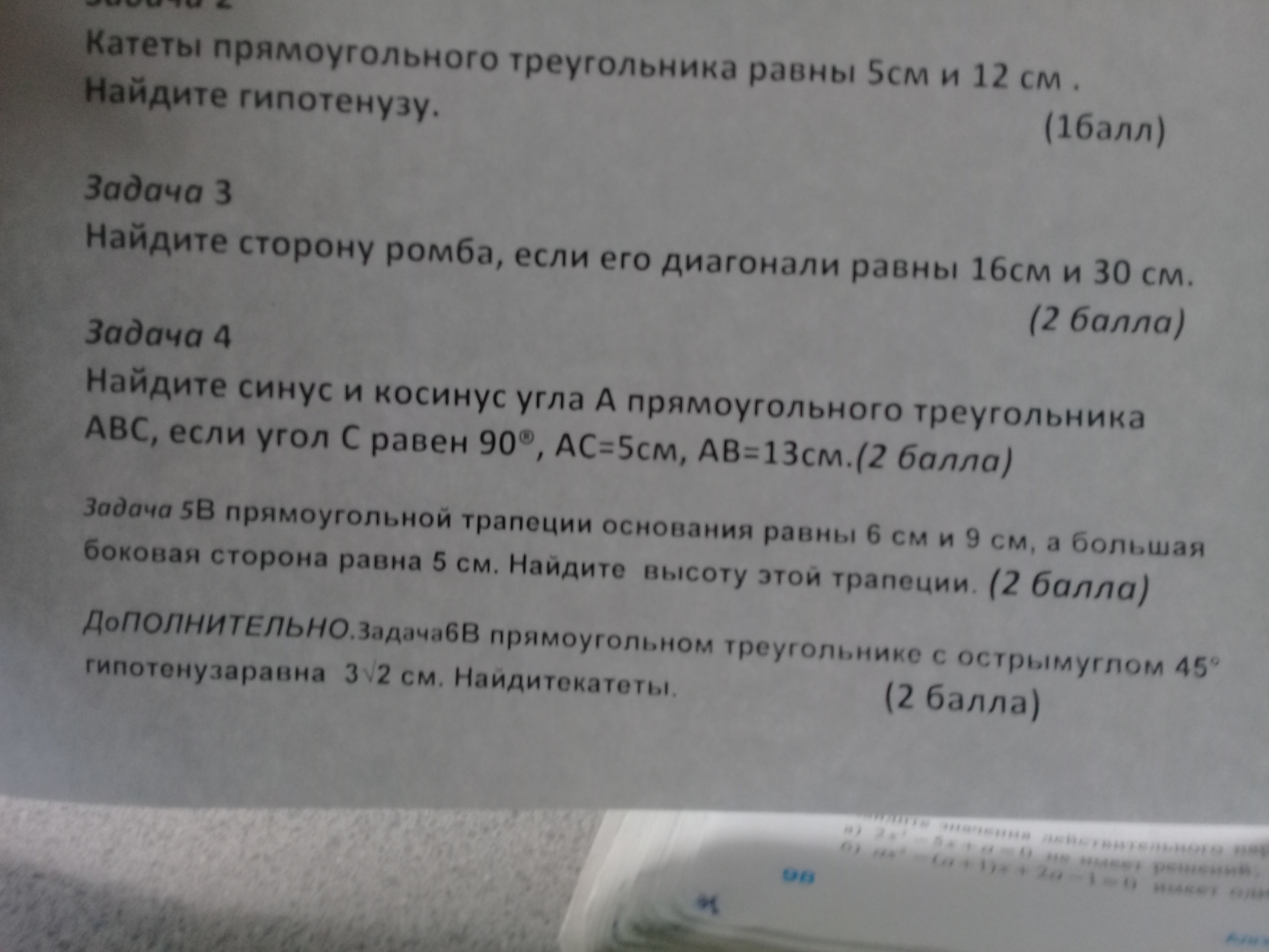 АС=5,АВ=13,угол С=90;соsA=АС/АВ=5/13;ВС=(корень) АВ^-AC^=8;sinA=BC/AB=8/13