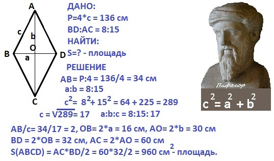 Дано: АВСД - ромб, Р=136 см, д1д2=815. т.О - точка пересечения диагоналей, АС и ВД - диагонали.