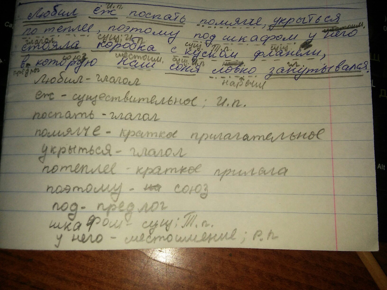 ║любил (сказуемое, глагол) еж (подлежащее, сущ., и.п.) поспать (сказуемое, глагол) помягче (обстоятельство, наречие), укрыться(сказуемое, глагол) потеплее(обстоятельство, наречие),║ поэтому (союз) под (предлог) шкафом (обстоятельство, сущ, т.п.) у (предлог) него (дополнение, местоимение, р.п.) стояла (сказуемое, глагол) коробка(подлежащее, сущ, и.п.) с (предлог) куском (дополнение, сущ, т.п.) фланели(дополнение, сущ, р.п.),║ в (предлог) которую (союз) наш(подлежащее, местоимение, и.п.) соня (подлежащее, сущ, и.п.) ловко (обстоятельство, наречие) закутывался (сказуемое, глагол).║
