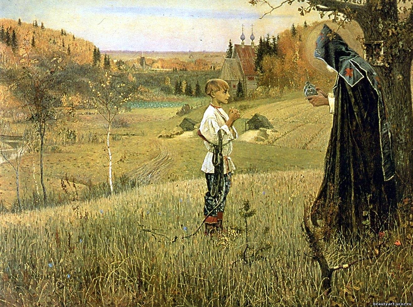 У меня почему-то, глядя на картину, создается впечатление, что это встреча мальчика с самим собой, каким он станет много лет спустя. Этот отрок, сменивший в монашестве имя, широко известен и почитаем на Руси как святой преподобный Сергий Радонежский, чудотворец. Его заслуги не только в основании, развитии и преобразовании монастырей, но и в примирении русских князей, объединении их перед Куликовской битвой, благословении и напутствии Дмитрия Донского.