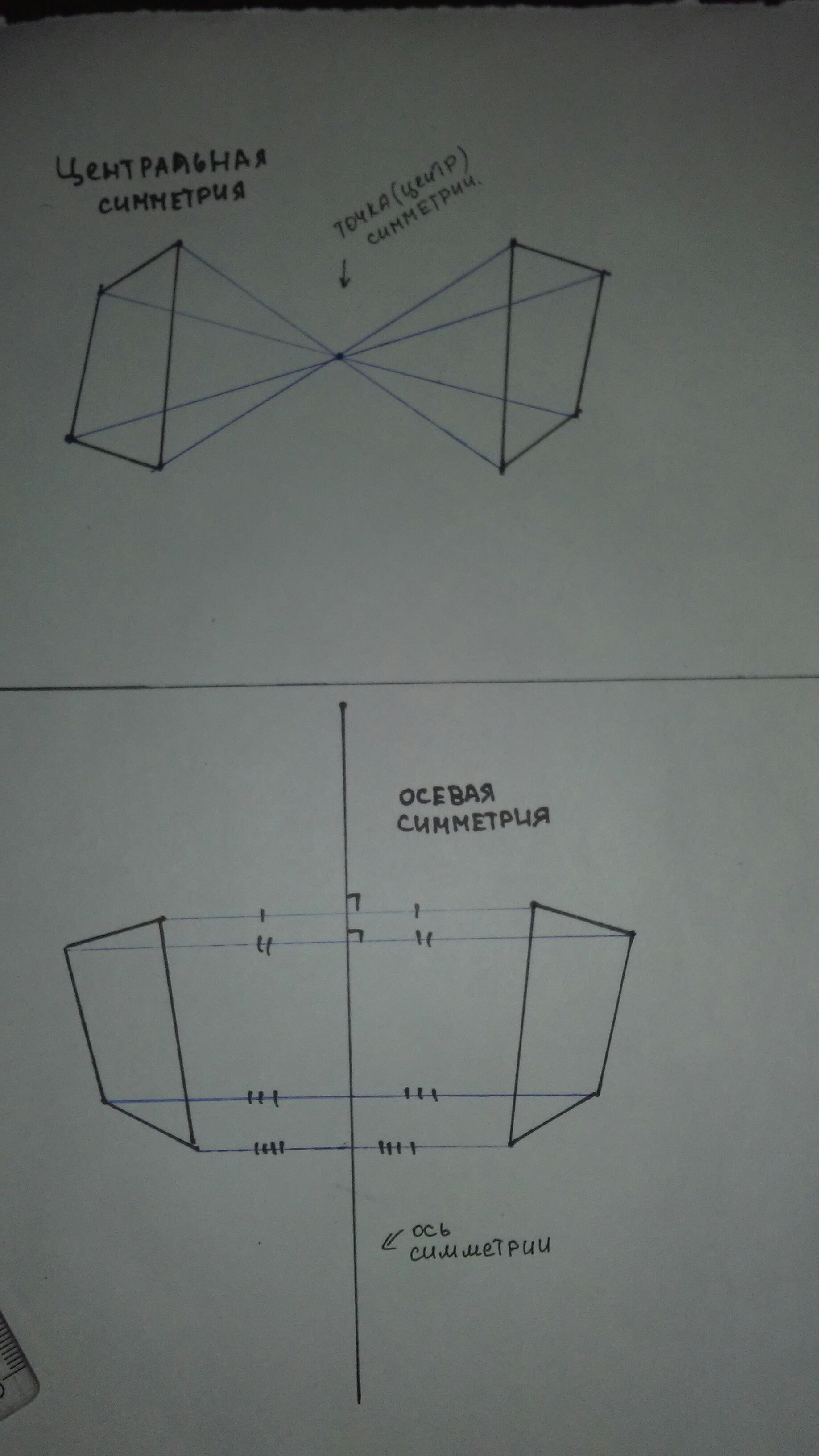 для центральной симметрии рядом с фигкрой отмечаешь точку и измеряешь расстояние от каждого угла фигуры до точки, а потом чертишь линию от угла до точки и продливаешь на это же расстояние. так с каждым углом и в конце просто соединяешь точки.